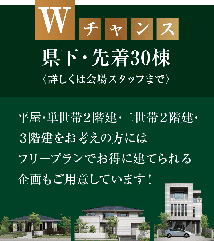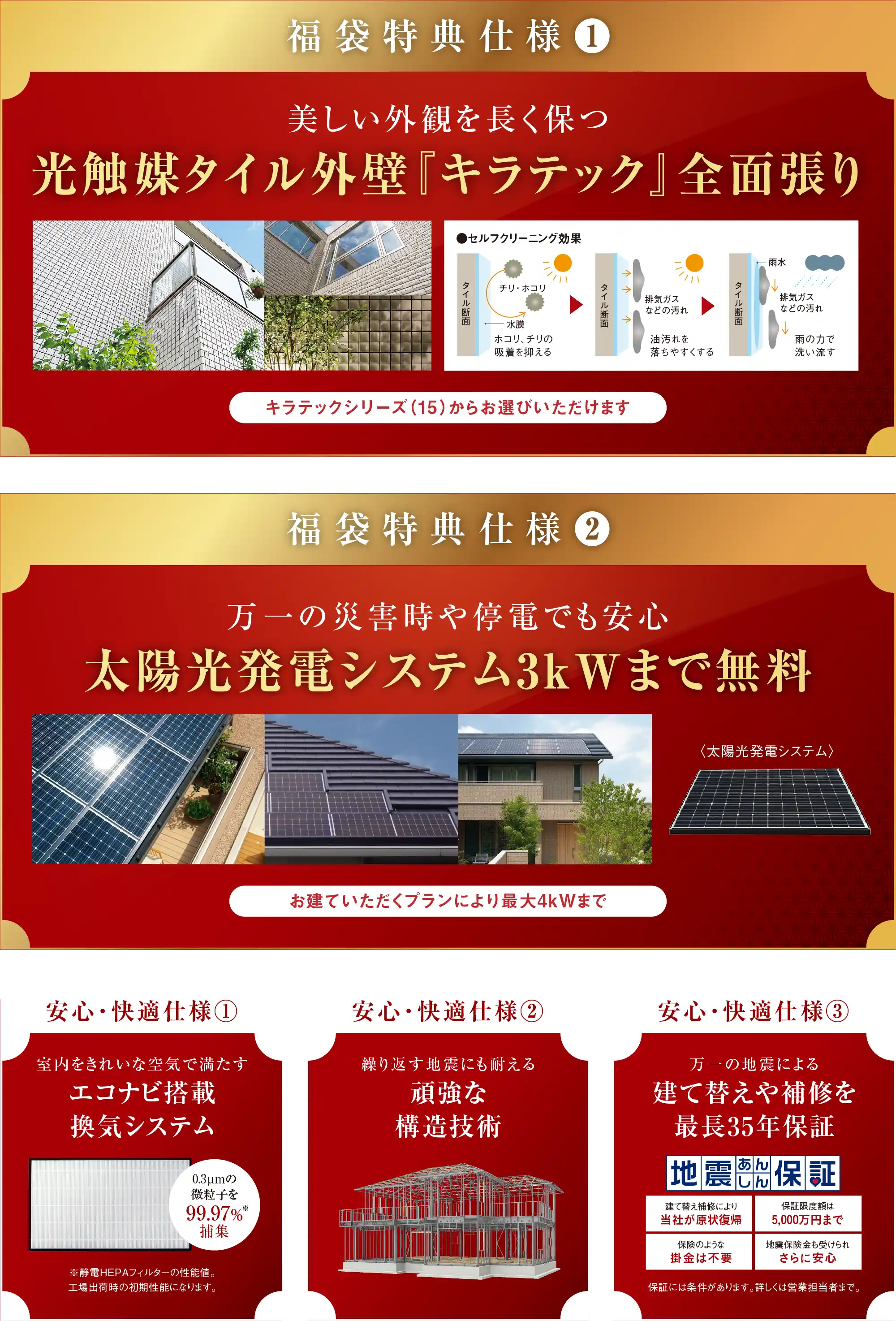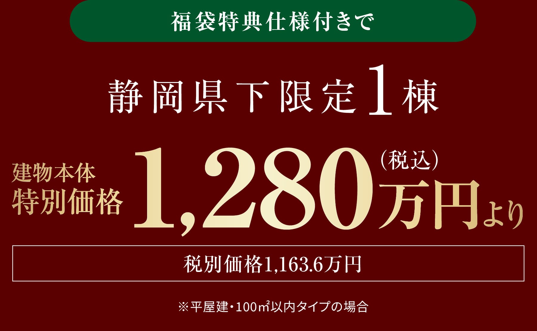 ■「2026初夢住宅福袋」お申込み条件・方法/●静岡県内でマイホームをお考えの方で、当社施工エリアに敷地(自己所有・建替・借地いずれも可)をお持ちの方。お申し込み者は建築するご本人とします。●ご契約期限/2026年2月28日●基礎着工期限/2026年6月30日●ご予定地に建築可能かどうかは担当者が現地調査のうえ、建築不可能な場合はお断りする場合もあります。●価格には建物本体・標準設備一式・キャンペーン特別仕様が含まれますが、屋外(給排水/電気)工事・確認申請料・地耐力測定費・諸経費等及び照明・カーテン等は別途ご負担いただきます。●キッチン・浴室などの2台目以降は別途ご負担いただきます。●価格は面積により異なる場合がありますので、係員にお問い合わせください。●お申し込み多数の場合は、抽選にて当選者を決定します。ご当選はお申し込み全数より1棟です。●抽選日は2026年2月19日(木)を予定。●次のものをご用意のうえ、受付会場にお越しください。◎印鑑◎敷地図(建築予定地の方位、間口奥行寸法、道路幅を明記したもの)●その他、詳しくは受付会場係員にお尋ねください。●広告有効期限/2026年2月15日(日)